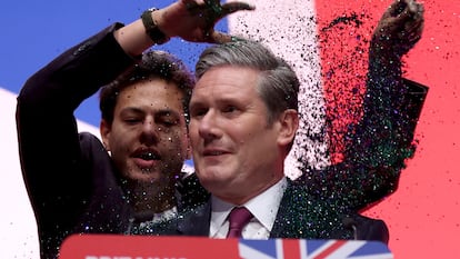 “True democracy is citizen-led, politics needs an update. We demand a people’s house!” Shouted an activist who rushed at Starmer and covered his jacket with glitter. With his right arm, the Labour leader blocked him from approaching the microphone as security reduced him to the ground and led him out of the auditorium. “If he thinks that bothers me, he doesn’t know me,” Starmer said, before quipping that he was glad he was the target and not his wife, “who is wearing a beautiful dress today.” Taking off his jacket and rolling up his sleeves, he added: “ Protest or power, that is why we changed our party,” to an ovation from supporters.
