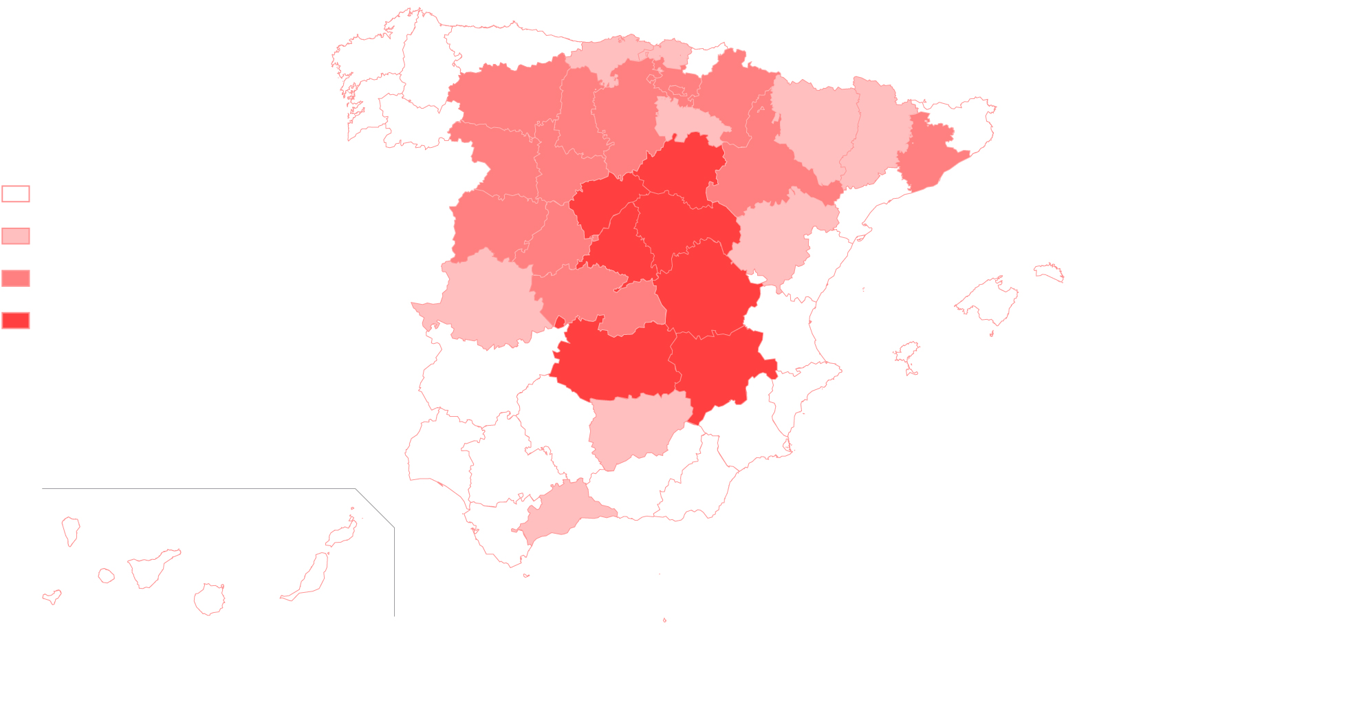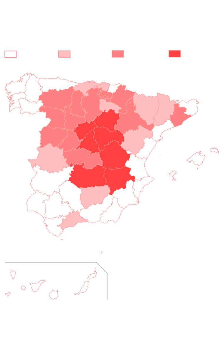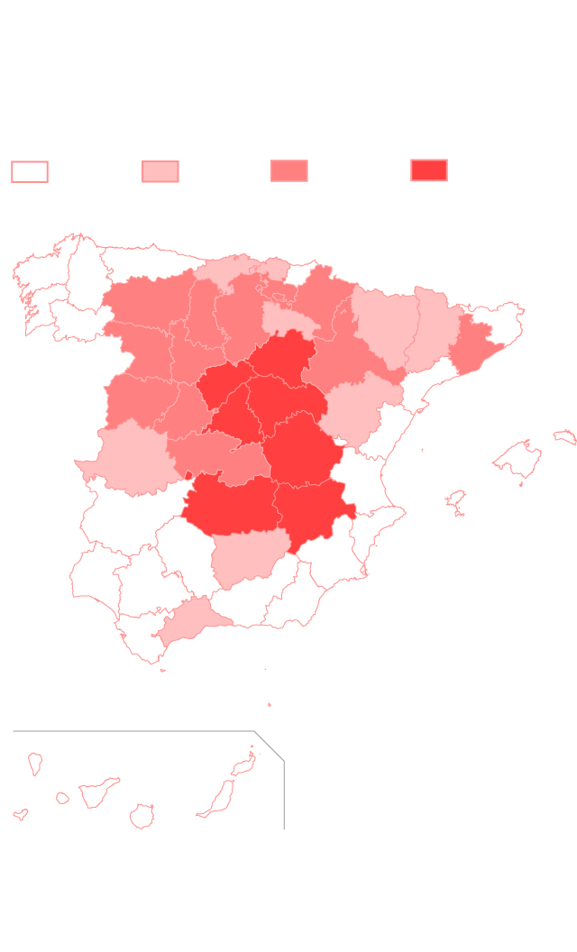 At the other end of the spectrum, Murcia, Asturias, the Canary Islands, and the exclave cities of Ceuta and Melilla in North Africa showed a prevalence of under 2%. A map shows that provinces located near Madrid have similar figures: 12.6% in Segovia, 10.9% in Guadalajara and 13.5% in Cuenca.